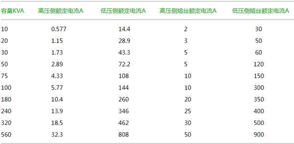 ①一次熔丝的额定电流按变压器额定电流的倍数选定,10-100kVA变压器为1-3倍;100kVA以上变压器为1.5-2倍。