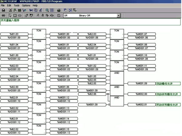 下图是ABB最普通的PLC,其中TON是通电延时时间继电器模块,用于开关量信号的防抖操作: