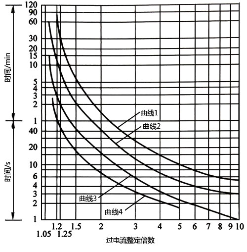 线1为三相笼型异步电动机容许的过载反时限动作特性;曲线2为热继电器的冷态过载反时限动作特性;曲线3为热继电器的热态过载反时限动作特性;曲线4为热继电器的断相保护特性曲线。