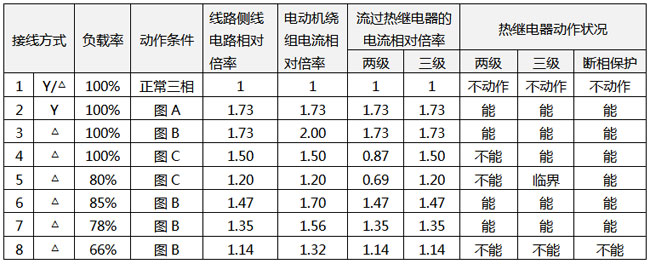 表3 电动机出现断相时各绕组的电流、流过热继电器的电流及热继电器保护状况