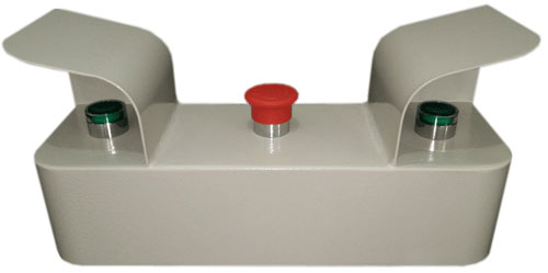 双手按钮工作原理是2常开2常闭总共4个信号触点连接到安全继电器,由安全继电器对双手按钮的状态进行判断。当且仅当两个按钮在0.5s内同时按下时,安全继电器才会有输出,该系统才能够启动机器动作,任何一个触点的故障,均可以被监控判断,当任何一只手离开按钮,安全装置就立刻停止输出,切断动力源,从而实现安全保护的目的。任何一只按钮的提前或推迟工作,都不会出现危险。