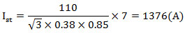 ①计算电机启动时整体负载功率因数:电动机启动时功率因数极低,有论文经过计算给出了0.22的数值,另外查询ABB提供的资料也可以验证这一点。故此我们可以考虑电动机启动时功率因数取值为0.2,此时在本案中电机启动电流为