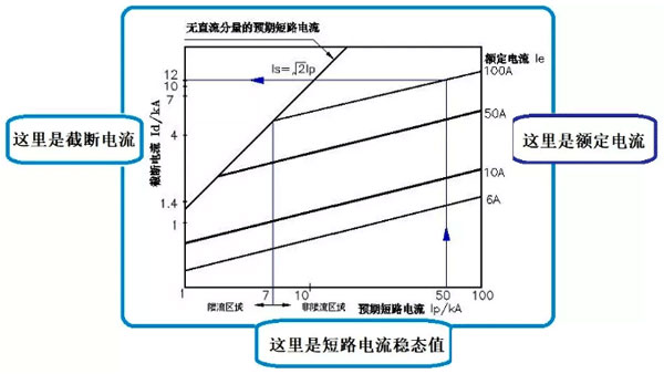 图中举了一个例子:短路电流是50kA,熔断器的额定电流是100A,我们从横坐标的50kA处往上与100A曲线的交点处,往左在纵坐标处查得截断电流Ic,Ic大约等于11kA,说明熔断器和负荷开关,它的实际短路动作电流就是11kA。