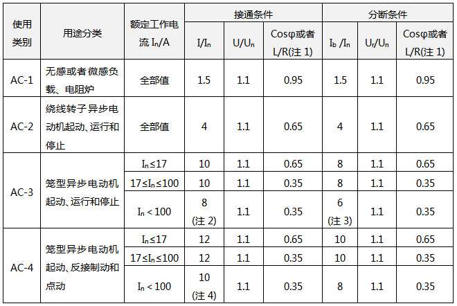 例如在AC-2、AC-3和AC-4下工作的交流接触器应当能满足AC-3类最大额定工作电流8倍的过电流。630A及以下的接触器承载时间是10s,630A以上的接触器承载时间会略微缩短。交流接触器的使用类别和通断条件见表。