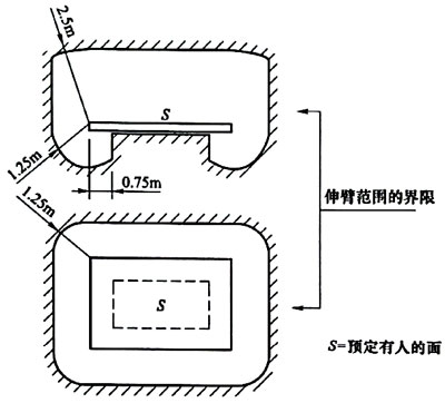 4、裸带电体置于伸臂范围之外。在电气专用房间或区域,未采用遮栏、外护物或阻挡物时,应将裸带电体置于伸臂范围之外,以防止人可能无意识地同时触及到不同电位的可导电部分。伸臂范围应符合下列规定(见图1):
