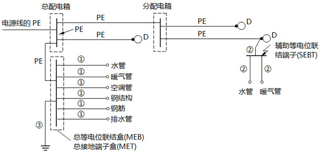图1 PE导体和保护联结导体示例(图例说明:①为接到MEB(或MET)的保护联接导体;②为辅助联结的保护联结导体;③为接地导体;D为防雷击Ⅰ类的用电设备,与设备外露可导电部分接地端子)