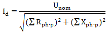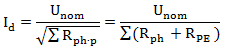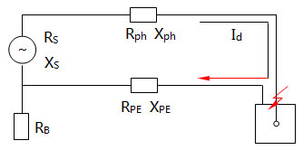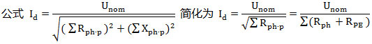 说明:Rph为相导体电阻,mΩ;Xph为相导体电抗,mΩ;RPE为PE导体电阻,mΩ;XPE为PE导体电抗,mΩ;RB为变压器中性点接地电阻,mΩ;Rs为变压器低压侧内电阻,mΩ;Xs为变压器低压侧内电抗,mΩ;Id为接地故障电流(交流方均根值),以下统称故障电流,kA。