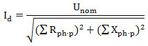 公式1中:Unom为相导体对地标称电压,V;Rph•p为相保回路电阻,mΩ;Xph•p为相保回路电抗,mΩ;为故障回路电阻、为故障回路电抗,包括高压侧系统阻抗(归算到低压侧)及变压器、低压母线、低压线路相保电阻之和、电抗之和,mΩ。