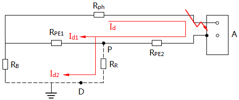 ②做重复接地,故障时接触电压(Uf•R)计算,为A到地(D点)的电位差:U f•R=Id×RPE2+Id2×RR,在图4中,(RR+RB)同RPE1并联,则Id2×(RR+RB)=Id1×RPE1,而Id1=Id-Id2,所以Id2×(RR+RB)=(Id-Id2)×RPE1,经整理,可得