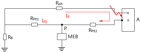 ③做等电位联结,故障时接触电压(Uf•EB),为A到P点(MEB处)的电位差,计算式如下:Uf•EB=Id×RPE2