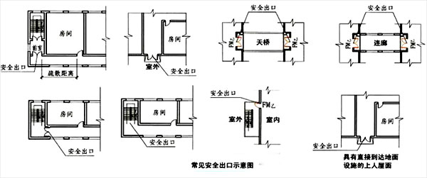 在GB50016-2014《建筑设计防火规范》中2.1.14条 将供人员安全疏散用的楼梯间和室外楼梯的出入口或直通室内外安全区域的出口定义为“安全出口”。其中“室内安全区域”包含符合GB50016-2014相关要求的避难层、避难走道等,“室外安全区域”包括室外地面、符合疏散要求并具有直接到达地面设施的上人屋面、平台及满足GB50016-2014《建筑设计防火规范》相关要求的天桥、连廊等。
