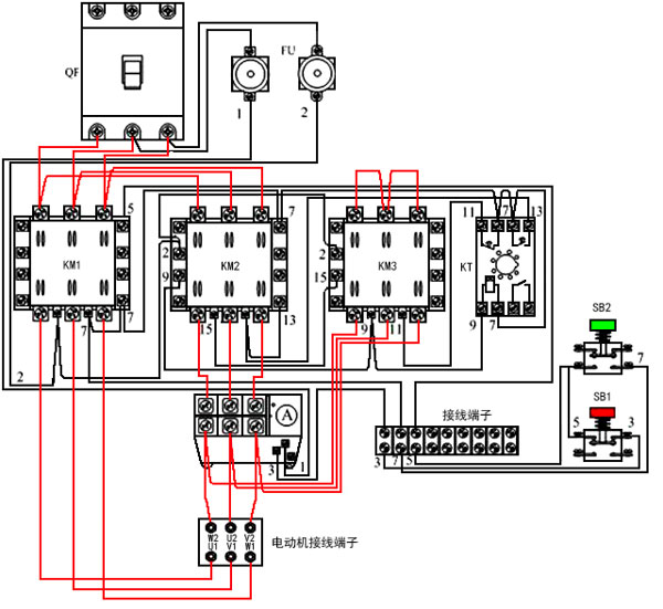 3、然后由三角形“接力”,把已经有相当高转速的电机,通过全压(380V)接入迅速把电机推向额定转速(转换的瞬间电流虽会有跳变但已无多大的影响了),带动负载正常运转。