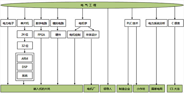 看图说话,电气工程这个树根,经过发展以后,生出的众多技能分支,足够成为一棵大树。下面再简单说一下各个分支的内容。