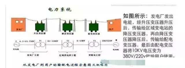 电力系统的概念是:由发电、输电、变电、配电、用电的设备及相应的辅助系统组成的电能生产、输送、分配、使用的统一整体。