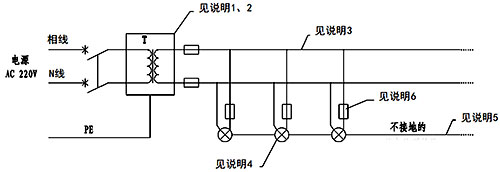 1、本示例采用一台隔离变压器(T)为多个室外灯具供电,还需采用不接地的等电位联结将各灯具金属外壳可靠连接。